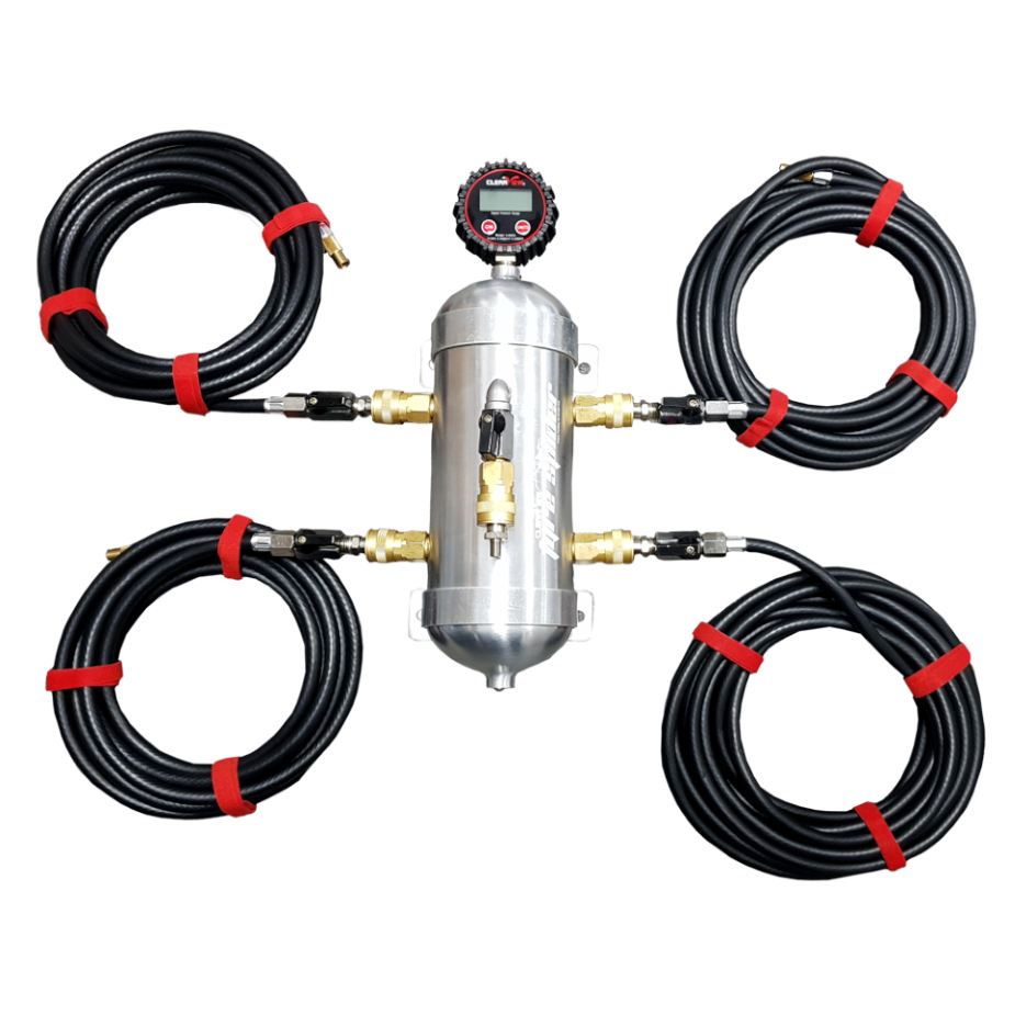 The Clearview Tyre Spider allows you to manage your tyre pressures faster and easier, so you can spend less time bending down and kneeling at each tyre! Whether you’re driving on sand or through muddy/soft tracks, the Tyre Spider will simply and quickly assist you to adjust the tyre pressures evenly of your vehicle, caravan or trailer. Designed to work independently OR attached to your vehicles air-compressor. The Tyre Spider has 4 individual valves, one for each tyre and 1 main valve. The Tyre Spider has four main functions: Inflation – Inflate up to 4 tyres simultaneously via an air-compressor. The Tyre Spider allows you to easily stagger tyre pressures across any combination of tyres with the 4 controllable inlet valves and digital pressure gauge. Each kit contains two 5 metre hoses and two 8 metre hoses for simple use on the longest of wheel-based vehicles. |