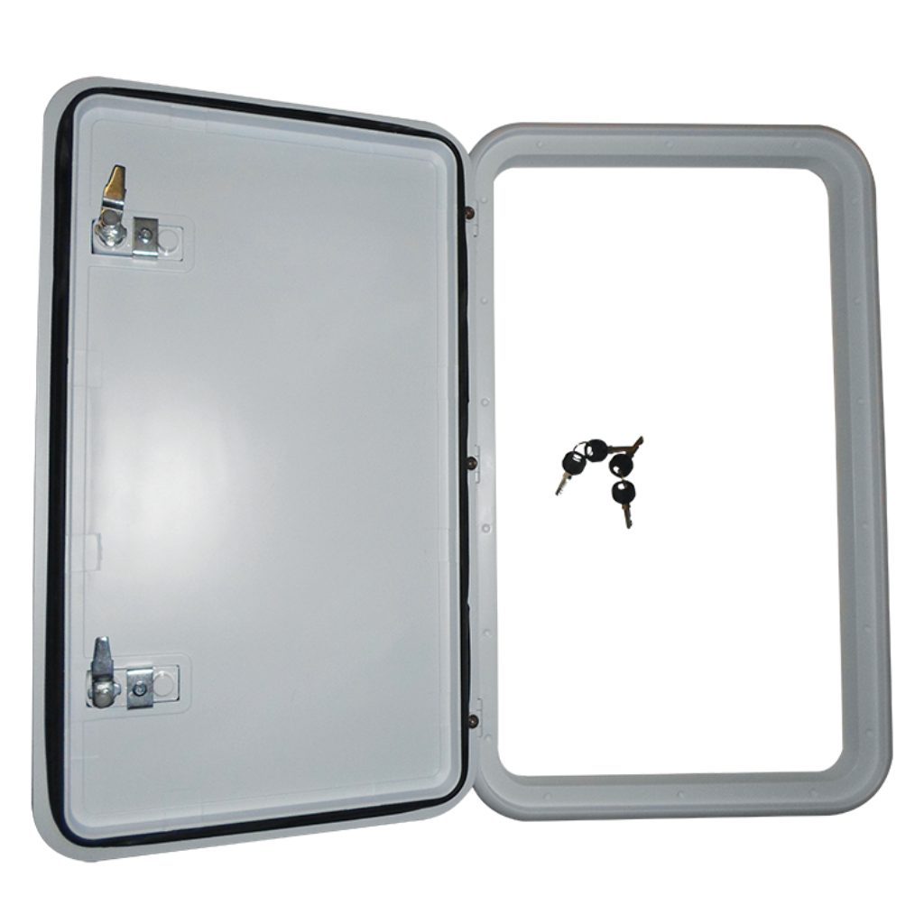 Coast Door 2 – White 415 x 681 (M500-110). Utilise the cavities in your RV body to create much needed storage space and use the Coast Doors to access them. Available in eight handy sizes, the Coast Doors are available in white with a smooth and modern finish. Installation has been streamlined – screw holes are pre-drilled and they are supplied as a complete door, meaning there is no need to infill. It features an effective door seal and comes with keys to lock and reopen. |