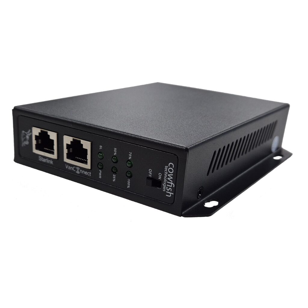 Cowfish Technologies Starlink Gen 2 Integration Kit A – Weatherproof. The perfect solution for powering your Starlink Dishy whilst on the road. Designed specifically for use in Caravans, Motorhomes and RVs, the Cowfish Starlink Integration Kit allows you to operate your Starlink Dish from your 12V battery system, ensuring reliable and consistent connectivity even in the most remote locations.  This removes the requirement to run an inverter to power the Starlink System and therefor eliminates the losses incurred by the use of an inverter. The Integration Kit links the Starlink Dish to the VanConnect system, giving you all the benefits of the VanConnect over the original Starlink router. A complete 12 volt system with a further reaching WiFi network, optional 4G/5G internet fallback and an integrated media centre. |