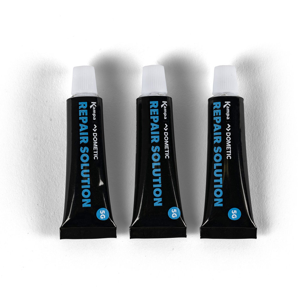 The Dometic Repair Solution can permanently repair holes and rips fast in most materials and surfaces. Great for repairing holes and rips in tents, awnings, inflatable products including tents, boats, toys and airbeds, self inflating mattresses, waterproof clothing, gum boots, waders, shoes, horse rugs, umbrellas, sails, bags, paddling pools, fishing and hunting gear, etc. |