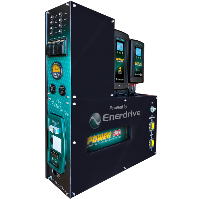 The Enerdrive K-ADVENTURER-01 Adventurer System 40AC 40DC 2000X Inc Epro+: This system is designed for the end user requiring maximum power requirements along with AC charging ability and 230v Inverter power. Available in 3 different versions; K-ADVENTURER-01 inc ePRO PLUS Battery Monitor K-ADVENTURER-02 inc Simarine Battery Monitoring K-ADVENTURER-03 inc Simarine & Individual Load Monitoring The Adventurer 01 for example consists of the items listed below. |