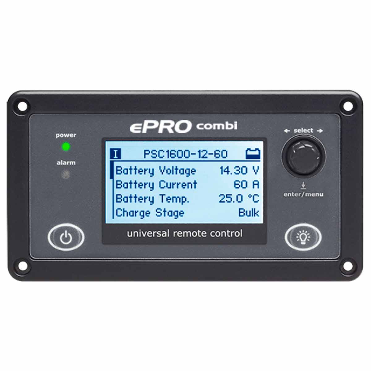 Enerdrive ePRO Combi 12/3000-120 W/Remote is designed for an uninterruptible AC power supply (UPS). In case of a grid/generator failure or disconnection, the Enerdrive ePRO Combi 12/3000-120 W/Remote immediately stops charging the battery, releases the AC transfer switch and activates the inverter which takes over the supply to the connected loads. All this is achieved so fast, that even very critical loads like computers will continue to operate without any issues. In case the grid/generator is reconnected again, and the voltage and frequency are within acceptable limits, the ePRO Combi activates the AC transfer switch and battery charger again, while deactivating the inverter. The connected loads are now supplied again by the grid/generator without any interruption. Includes Universal Remote Control (URC) – The URC can be used to remotely readout all available parameters from your ePRO inverter/charger Combi, like charging current, output voltage, charge stage etc. It is also possible to put the Combi in standby mode or to wake it up again, besides being able to control the maximum charge current and the maximum AC input current. All information is shown on a clear white backlit graphical display. This kit comes with mounting screws and a 3-meter interface cable (standard cat5 patch cable). The URC automatically recognizes to which type of equipment it is connected. With so many internal features the ePRO Combi will provide you with all the requirements for on-board power along with: |