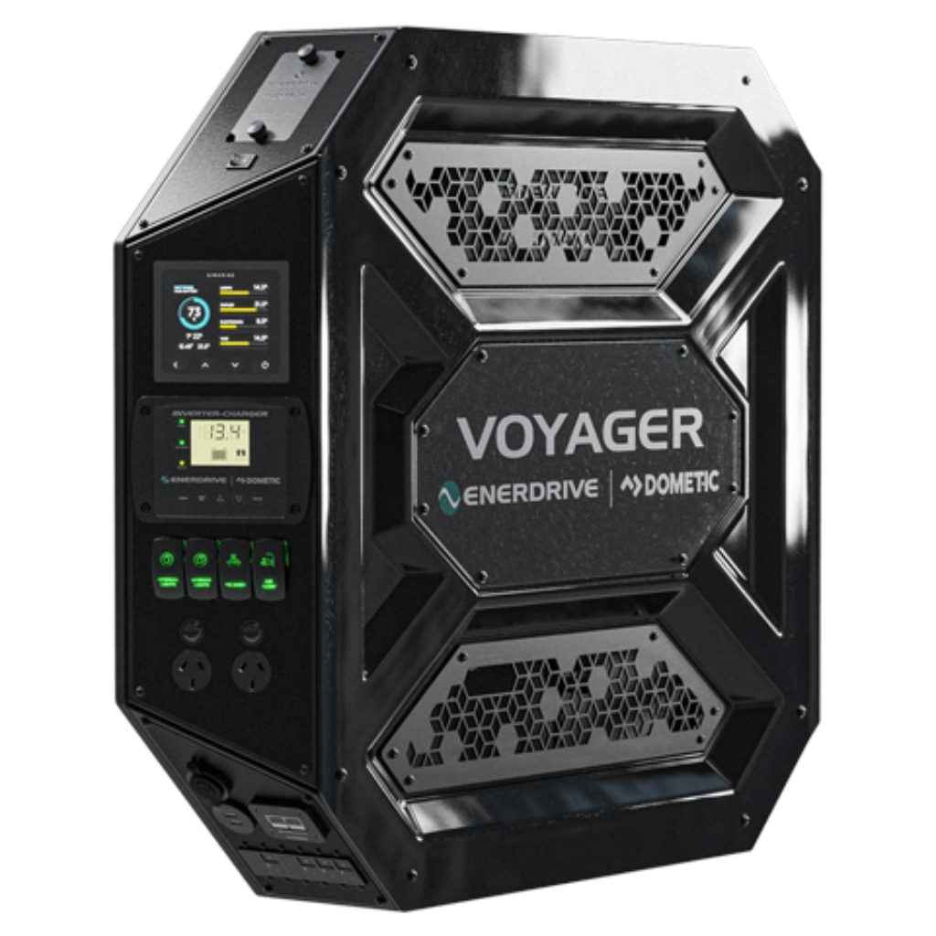 Enerdrive K-V3L01 Voyager System 3000W/100A Inverter-Charger 40DC Inc Simarine SCQ50 – Left. Through extensive research on new manufacturing methods and hundreds of hours of physical prototype testing, Enerdrive |Dometic have developed an all new canopy system. Featuring a new 3000W/100A Inverter-Charger unit, paired with the B-TEC range of batteries, the Voyager leads the charge in delivering truly next-generation off-grid power capabilities. The Voyager has been designed and built to give you access to every part of the build you may need without the hassle of finding tools to remove bulky covers or shifting everything within the canopy to access the side of your system. All of your loads connect via the custom flush mounted 1 in, 12 out fuse panel at the top of the system, main system breakers are located at the bottom of the system and a subtle finger hole in the bottom grill gives you access to the Combi’s RCD reset switch. The Voyager has been designed to make use of all available space in your canopy build. The octagonal shape allows you to push the Voyager closer to the door return on your canopy while still allowing access to the fuse panel when needed. The most prominent design feature of Voyager is the angled display panel. This panel allows you to read and access your instruments with greater ease no matter the orientation or mounting location. |