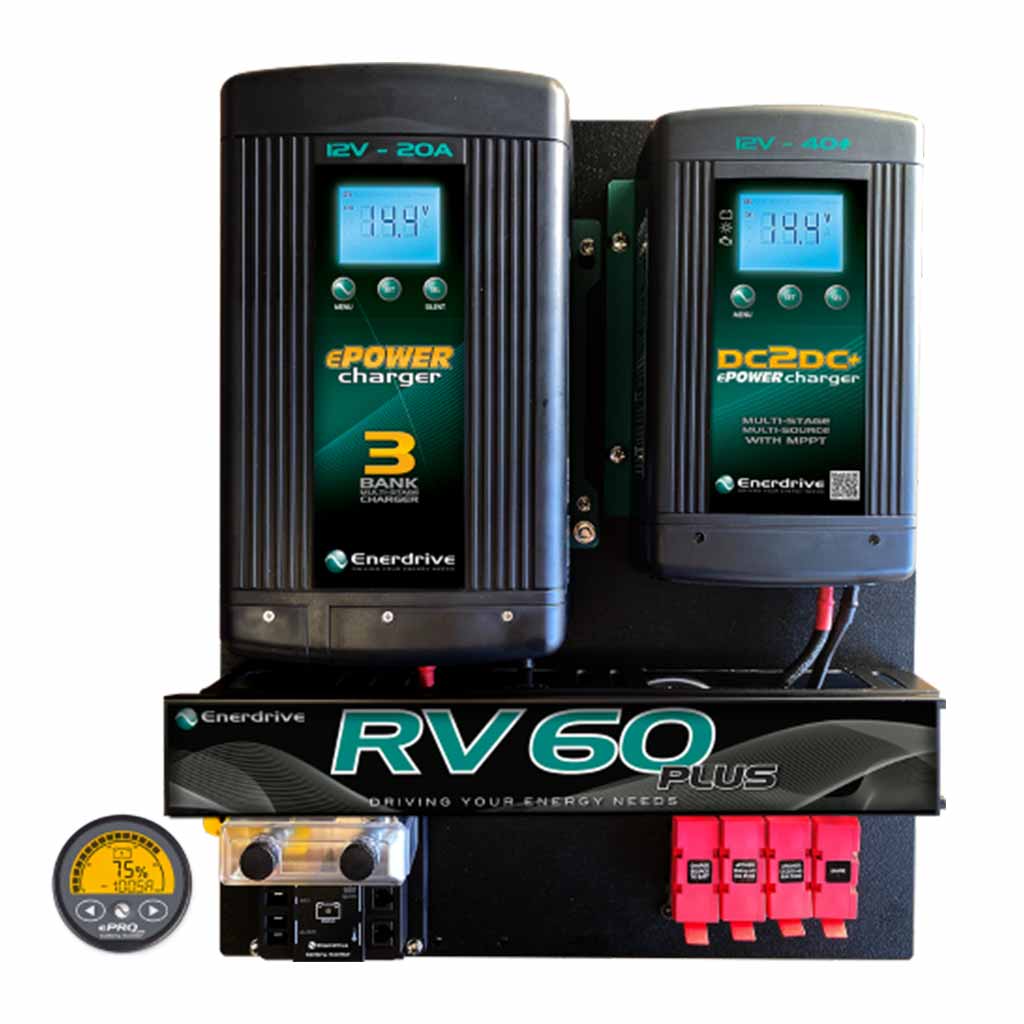 [/vc_column_text][/vc_column_inner][/vc_row_inner][/vc_tta_section][vc_tta_section title=”Enerdrive EN31220 ePOWER 12V-20A Multi-Bank Battery Charger” tab_id=”1659050774588-f21e1eee-074e4015-309d”][vc_row_inner content_placement=”middle”][vc_column_inner][vc_column_text]The Enerdrive K-RV-60-01 RV 60 Plus Board with Monitor includes The ePOWER 20A Battery Charger. The ePOWER 20A Battery Charger delivers a priority charge to Bank 1, or your main house battery bank which allows the charger to get this bank recharged the quickest, then transition the cycle to the lesser bank 2 & 3 batteries. The priority function also allows you to have a battery chemistry different to the other two, such as an AGM battery for house and lead calcium for your start banks. If all 3 banks need a charge, an over-ride function helps recover all 3 banks quickly and evenly before switching back to prioritise on Bank 1. The ePOWER 20A Battery Charger display gives you all the information you need for the operation of your charger. Immediately, key information such as charger amps, battery voltage and charge state continually alternate on the screen. When in float / power supply mode, the load amps are displayed so you can see exactly what the charger is doing. The display also allows you to program all settings of the charger, as well as activate the silent mode.[/vc_column_text]