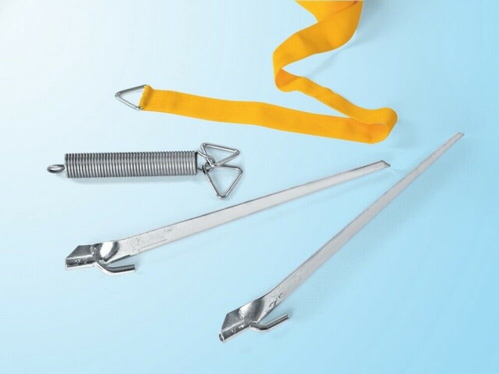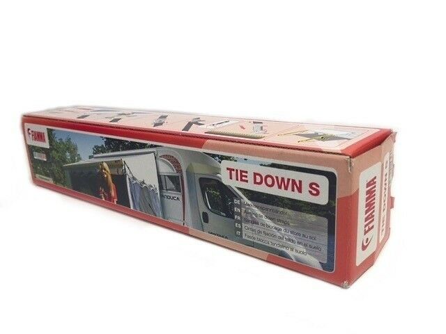 Fiamma Awning Tie Down Kit. Tiedowns, rope clip, tie downs F45s, f45, f35. Anchors awning to the ground in windy conditions. A Fiamma tie-down that allows for solid anchoring. It fits into the awning rails or the side clip of the privacy room. Comes with two 300cm adjustable bands and the necessary stakes and tension springs. |