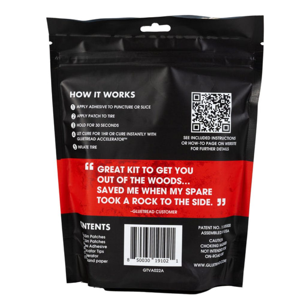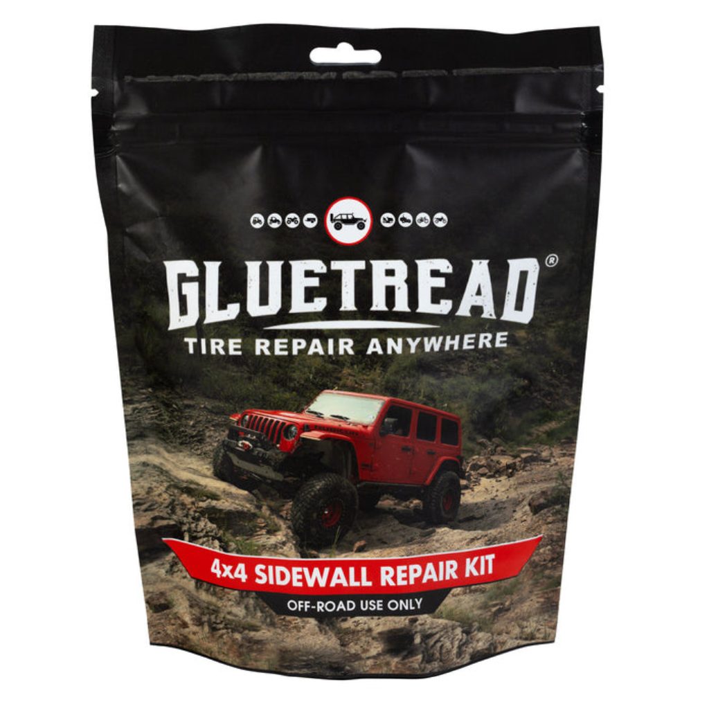 Gluetread GTVA028A 4×4 Full Size Sidewall Repair Kit. The GlueTread Full Size Sidewall Kit is designed for multiple sidewall repairs, offering durability and reliability for off-road vehicles. Tailored for full-size or 4×4 vehicles, this kit works equally well on other off-road vehicles, providing peace of mind wherever the trail takes you. |