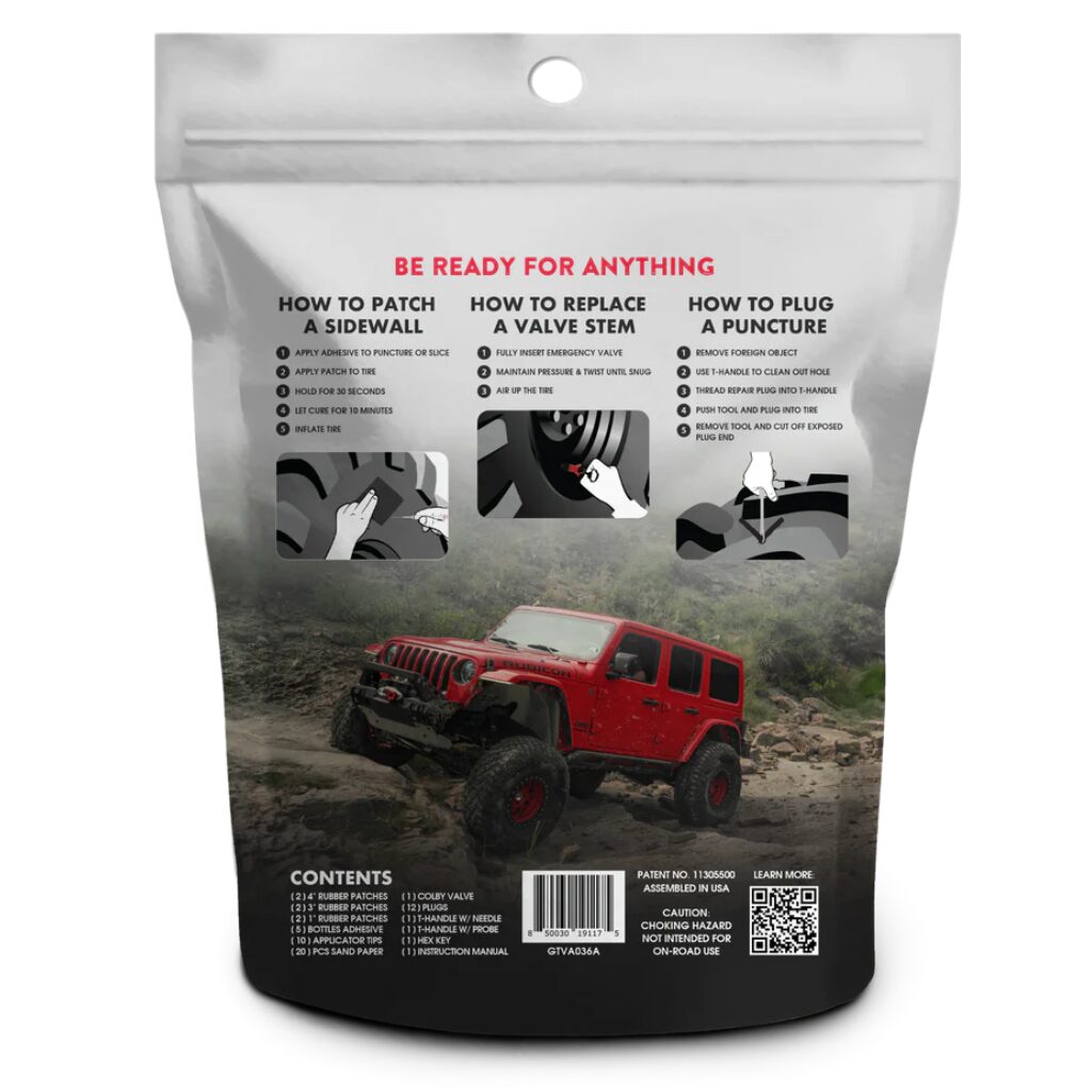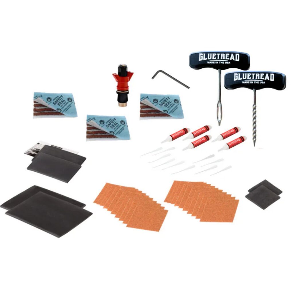 Gluetread GTVA036A Complete Tyre Repair Kit. The Gluetread Complete Kit is designed for repairing any kind of tyre damage you may get on the trail. If you need to repair a sidewall, replace a valve stem, or plug a puncture, you’ll be covered! For off-road use only. |