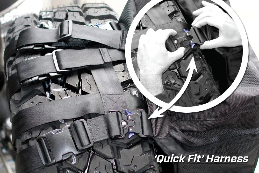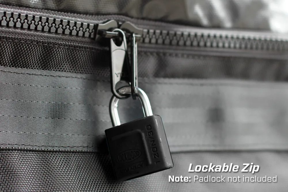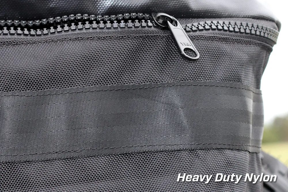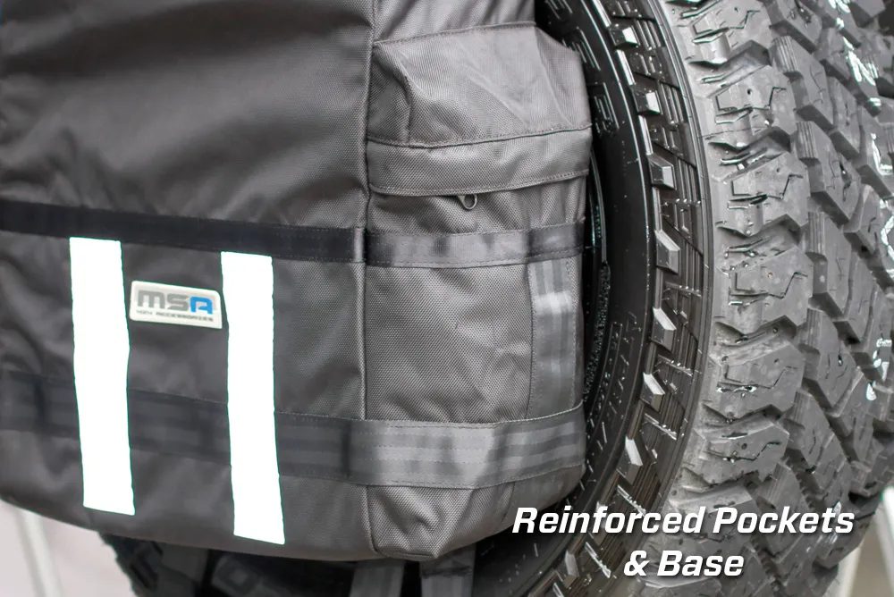 MSA 20001 Removable Rear Wheel Bag. The MSA Removable Rear Wheel Bag is great for carrying all your travel essentials securely, while freeing up space inside your car. Perfect for storing wet and muddy gear that you don’t want in the car. The Rear Wheel Bag is designed to provide maximum service life in the harsh Australian climate. Made from heavy duty 1680 Denier Oxford Nylon with a PVC stiffener insert, to maintain shape. The unique ‘Anti-Drop’ 50mm seatbelt harness system stops the bag from drooping behind the vehicle. The harness system is fully adjustable, it attaches directly to the rear wheel and suits any 4X4 vehicle tyre size. The side release buckles are heavy duty aluminium. The system can be attached and removed in as little as 30 seconds. Using the convenient carry handle, simply unclip the bag and take it anywhere. Extra storage is provided with the reinforced zippered pockets on each side, handy for those smaller straps, ropes and shackles. The front reflective strips enhance visibility at night. A stainless steel eyelet allows for drainage of any fluids. The Rear Wheel Bag can be padlocked onto the wheel with a lock strap. Added with the YKK Chunky Zip and two lockable metal sliders creates an extra level of security. The triple, reinforced base ensures stored gear stays secure and packed away while travelling on rough roads. |