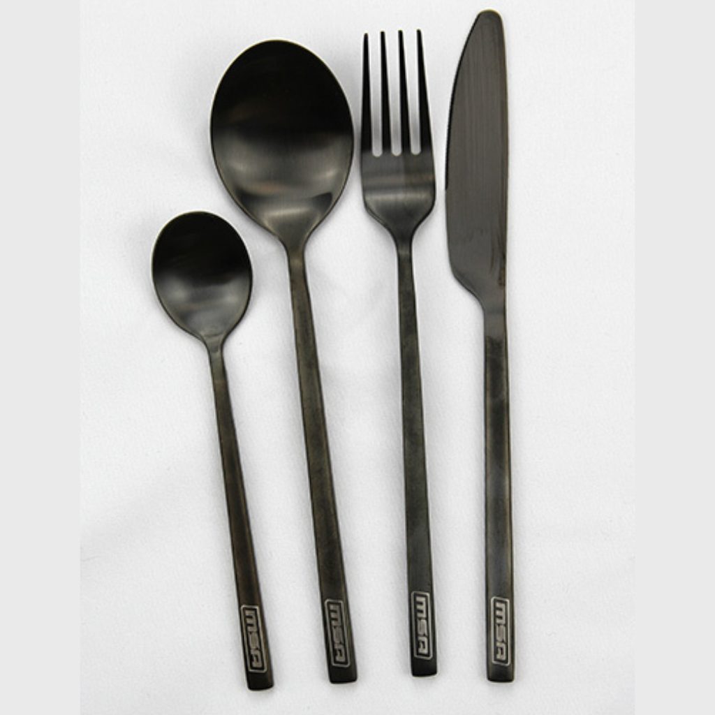 MSA 20006 Cutlery Set. The MSA Cutlery Set is high quality with a dark sleek finish. Constructed from 410 stainless steel and finished with a black PVD (Physical Vapor Deposition) coating. Enjoy a great meal with an added touch of class with a MSA 4×4 Cutlery Set. Easily cleaned, durable and brings you a touch of fine dining wherever you are. A fabulous all round cutlery set for anyone who enjoys the finer things in life. Perfectly complements the MSA 4×4 Cooking Knives Set, Utensil Set and Bamboo Cutting Board. The MSA 4×4 peace of mind, 2 Year Manufacturer’s Warranty applies. |