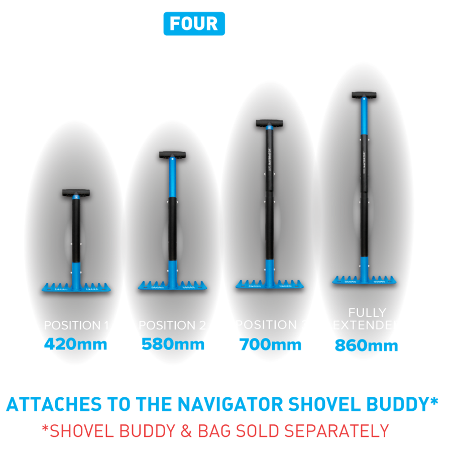 The Navigator NAV-048 Rake Head Attachment is made to be interchangeable with the Shovel Buddy head. Included is an extension shaft (360mm) which can also be used to extend the Shovel Buddy (Sold separately). Allowing you four length options. |
