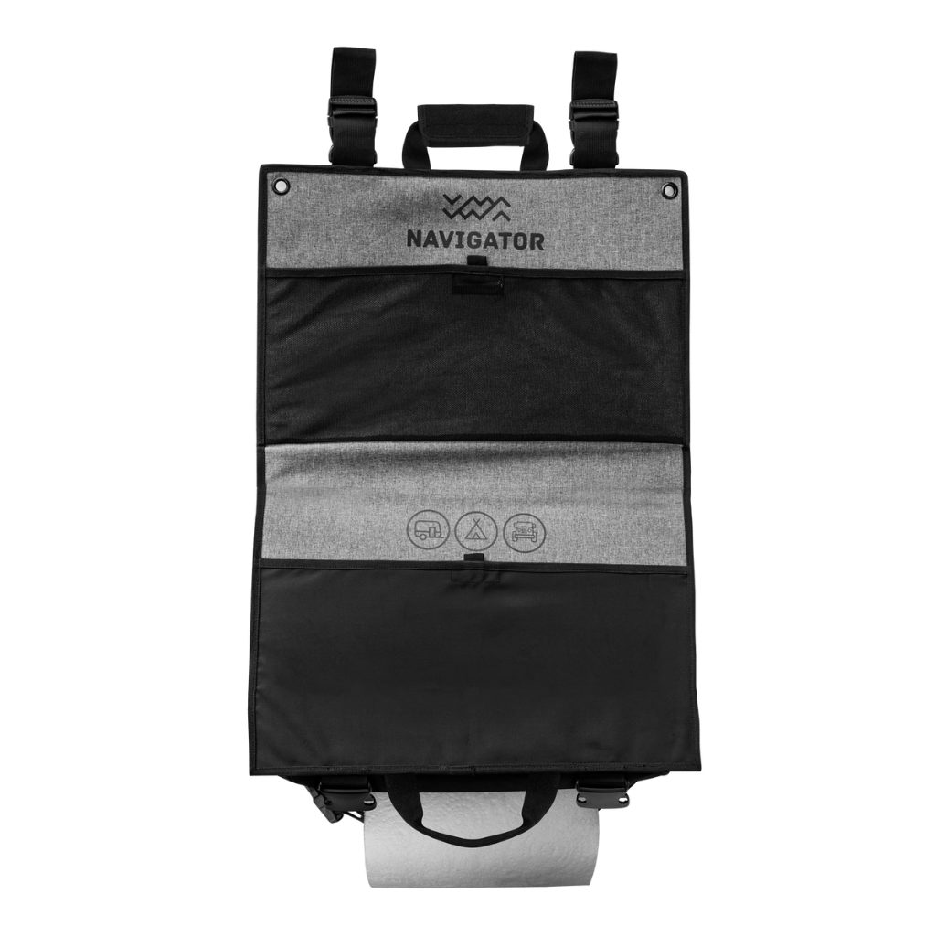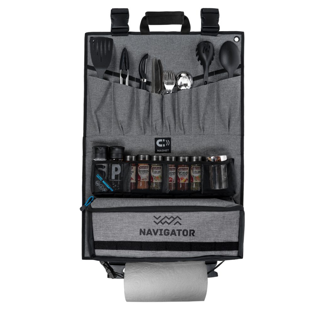 Navigator NAV-089 Kitchen Buddy + Adapter Straps. The Navigator Kitchen Buddy is the best in practical camp kitchen organisation. Featuring 8 sleeve pockets for utensils, 4 mesh pockets for cooking spices and condiments, a magnet to hold small metal items (like a bottle opener) and 2 large sleeve pockets for chopping boards. This Kitchen Buddy can be folded in half for quick and easy storage. Designed to easily attach to the Navigator Awning Buddy. However, the eyelets allow this accessory to be attached to camping ridge poles. The Kitchen Buddy can also be connected to the Navigator Outdoor Storage buddy. * Cutlery, spices, cable ties and bottle opener not included. |