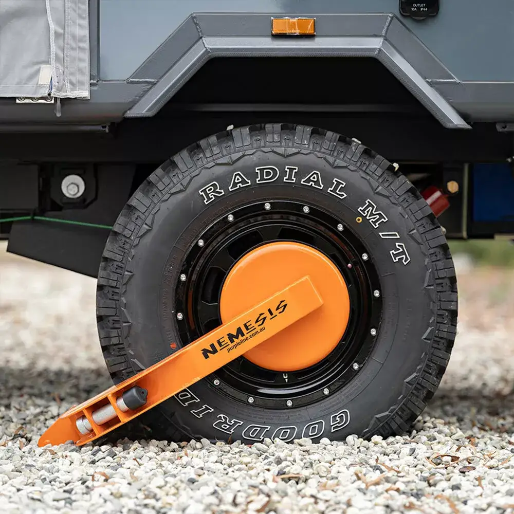 The Nemesis Wheel Lock is made from specially hardened high tensile steel which is resistant to cutting and drilling and incorporates an exclusive high security 9-lever barrel lock, resistant to picking drilling and gas freezing. The lock is made by Lowe and Fletcher (UK) and is supplied with a handy carry bag to store the unit when not in use. Built with composite metals, resistant to cutting, drilling and gas freezing, it incorporates a seven-pin, anti-pick and anti-drill locking bolt with a tubular anti-copy key. Strong, secure and tough, it remains quick and easy to fit. Suitable for on and off road wheels up 17″ and tyres up to 275mm cross-section. Now comes with three keys. The Nemesis wheel lock is the perfect highly visible deterrent!