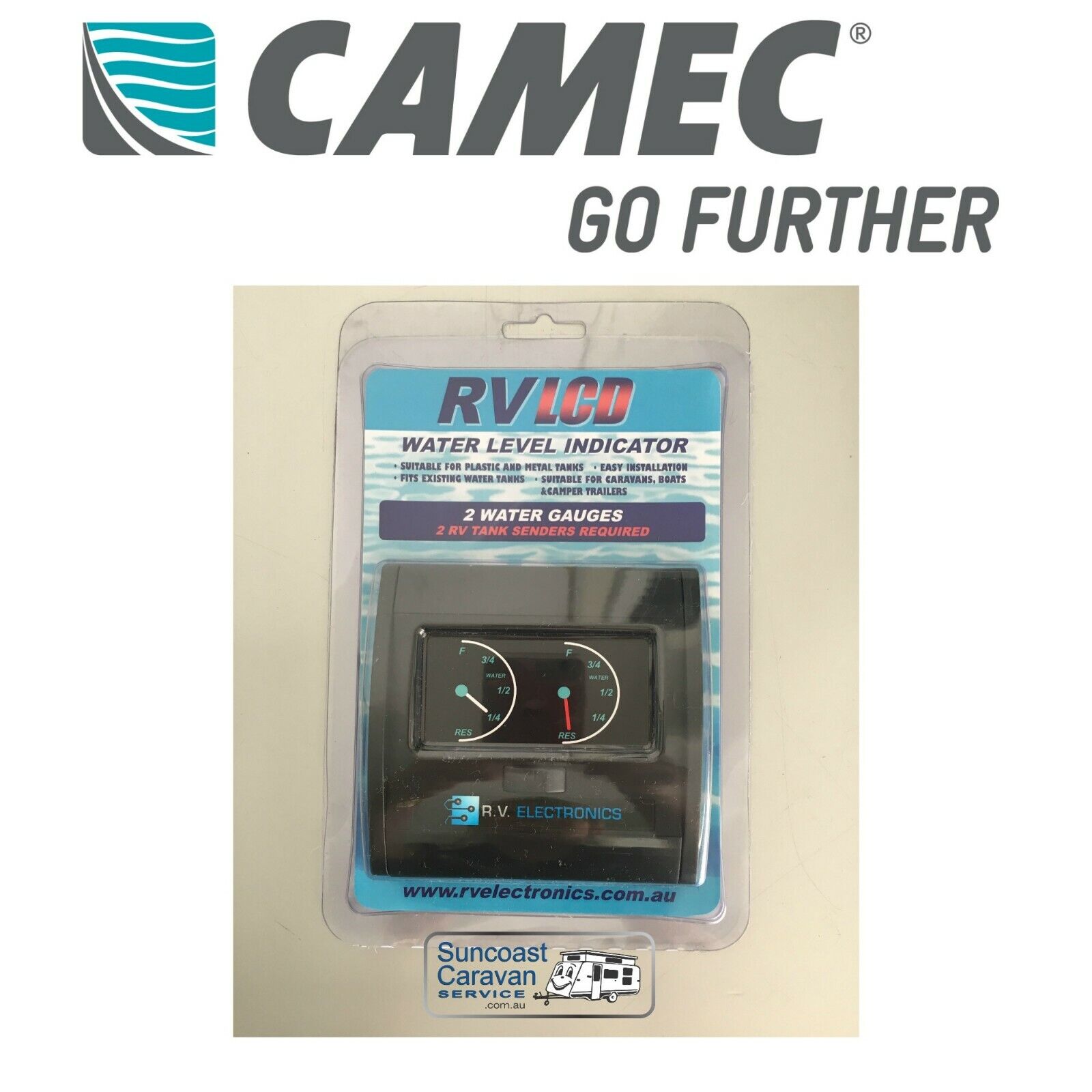 These new technology gauges have a coloured LCD analogue display with LED backlighting for crystal clear viewing. Colour of needle changes to red and flashes at the lowest (RES) level. The gauges draw 50mA so they can be left on without flattening your on-board battery. There is a power on/off switch to turn the gauge off when the caravan is not in use. The gauges can be matched with 2.5, 5, or 7.5metre lead sender probes (not included). The LCD Water gauge measures 108x108x20mm |