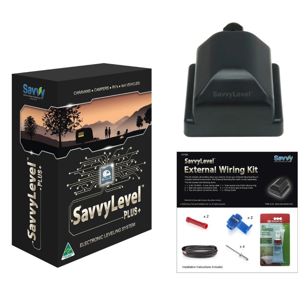 SavvyLevel S4 6191S4 with External Mounting Box & External Wiring Kit. Achieve perfect leveling in under 60 seconds with the SavvyLevel precision leveling device. Designed for caravans, campers, motorhomes, and 4WDs, the SavvyLevel S4 combines revolutionary ease and unmatched accuracy, allowing you to set up effortlessly from the comfort of your vehicle every time. The SavvyLevel S4, External Mount Box & External Wiring Kit is ideal for external installations. It includes the necessary wiring components and a protective external box for mounting the SavvyLevel on the A-frame. Opt for external installation if you have a heavily metalized caravan that interferes with the Bluetooth signal when mounted internally (test with the 9V battery adapter if uncertain) or if you prefer external mounting for wiring or other reasons. For proper installation, follow the instructions in the ‘SavvyLevel External Mount Installation Guide’ provided or visit our website at savvylevel.store, then navigate to Documentation -> External Installation. |