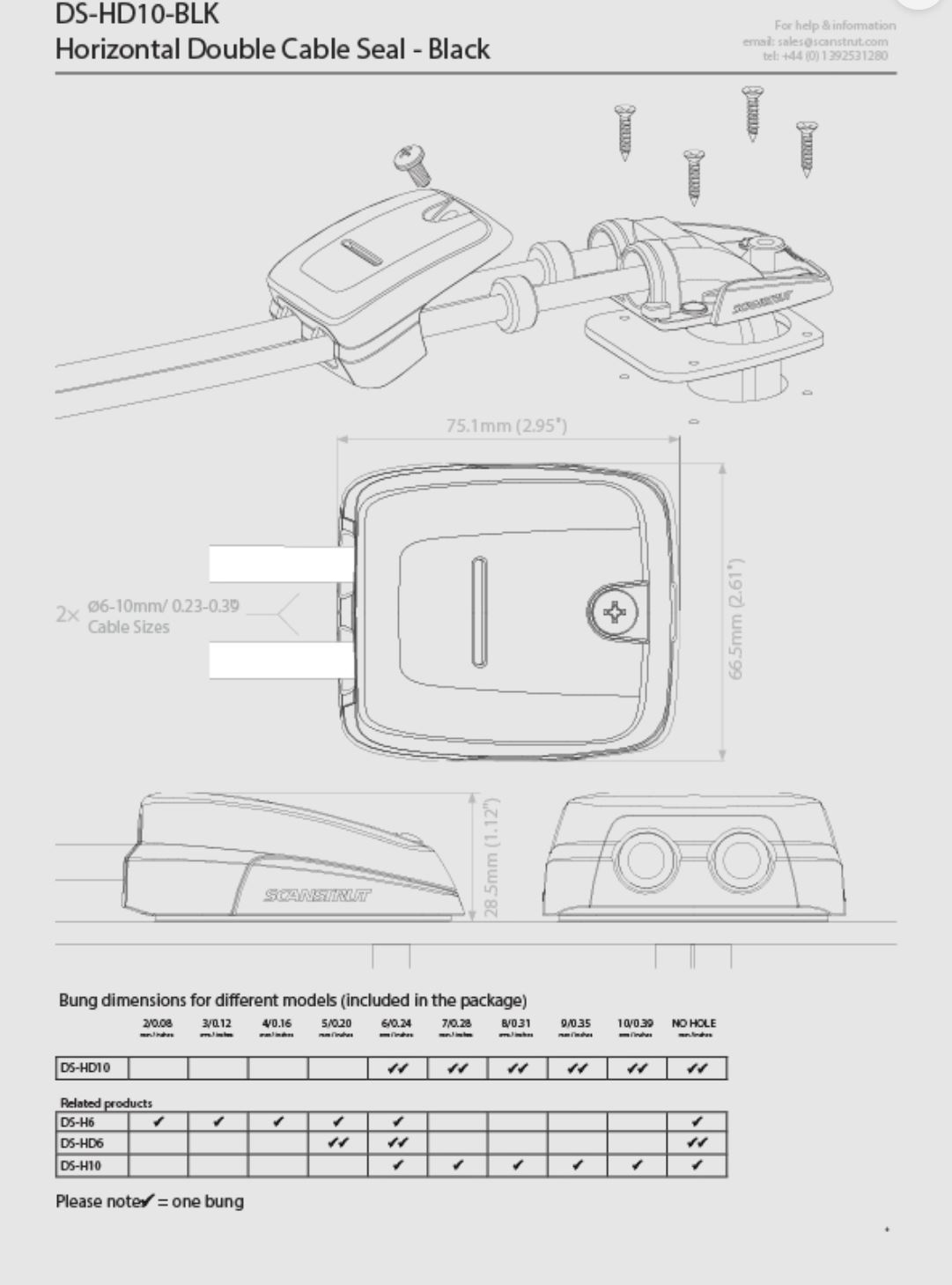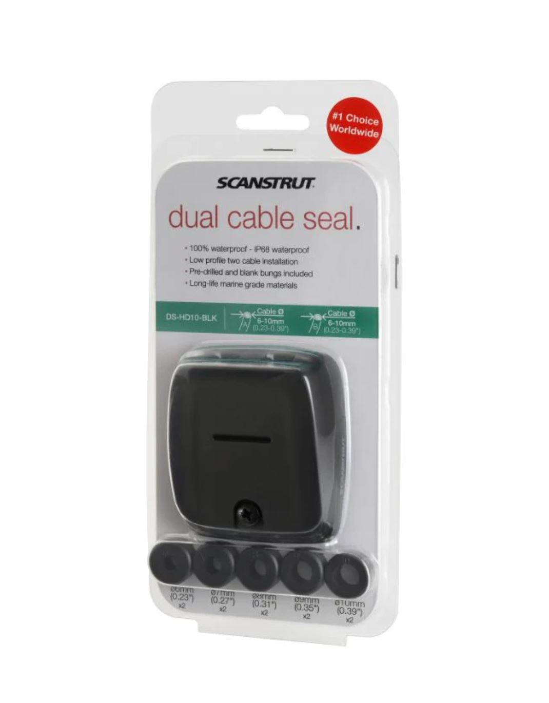 SCANSTRUT DS-HD10-BLK Double Horizontal Cable Seal – Black. The SCANSTRUT DS-HD10-BLK Double Horizontal Cable Seal keeps your cables secure. For cable combinations of 6mm, 7mm, 8mm, 9mm and 10mm – Ideal for solar panels, light bars, lights and other rooftop electronics. With a low-profile design, it provides a stronger, impact-resistant extra protection from water. Captive nuts in the base make for an easy assembly. Tapered bung forms a watertight seal. All units are supplied with a closed-cell base seal – 100% waterproof. All models have been IP68 tested and approved. Captive nuts make for easy assembly and also allow reliable repeat installations. Each unit is supplied with both pre-drilled and blank inner seals to make your installation as easy as possible. |