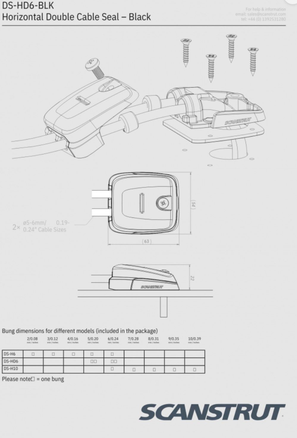 SCANSTRUT DS-HD6-BLK Double Horizontal Cable Seal – Black. The SCANSTRUT DS-HD6-BLK Double Horizontal Cable Seal keeps your cables secure. For cables from 2 cables – 5mm (0.19”) and 6mm (0.23”) in any combination – Ideal for solar panel installations. With a low-profile dome shaped design, it provides a stronger, impact-resistant extra protection from water. Captive nuts in the base make for an easy assembly. Tapered bung forms a watertight seal. All units are supplied with a closed-cell base seal – 100% waterproof. All models have been IP68 tested and approved. Captive nuts make for easy assembly and also allow reliable repeat installations. Each unit is supplied with both pre-drilled and blank inner seals to make your installation as easy as possible. |