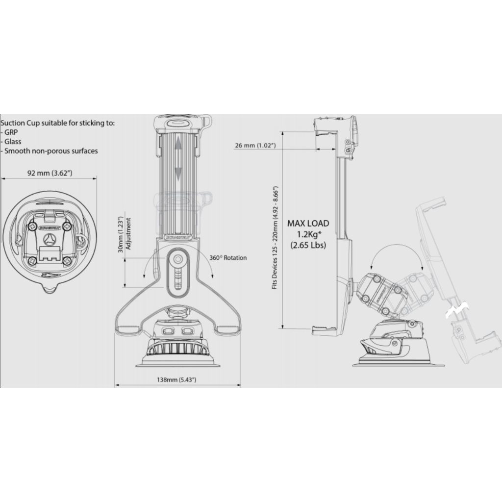 The SCANSTRUT RLS-508-405 Rokk Mini Tablet Clamp Kit with Suction Cup Base allows you to suction your tablet on any smooth, flat and clean surface. The 360-degree aluminium body features a metal-on-metal locking system, which increases the clamping effects to achieve 100% locking force. Your Tablet will not move until you want it to. |