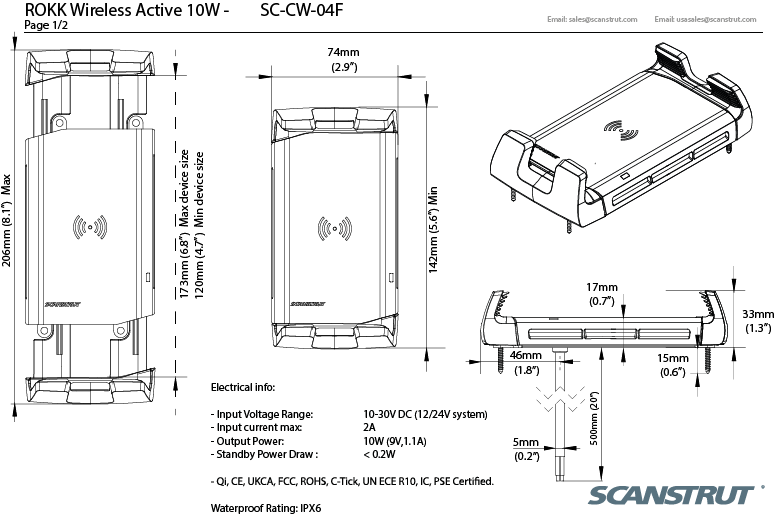 SCANSTRUT SC-CW-04F ROKK Wireless 12/24V Waterproof Phone Charging – Active. Dock. Charge. Connect. Active 10W securely holds and wirelessly charges your phone even in the toughest conditions. Now you can keep your phone in reach, fully charged and ready to go. 10W Waterproof Wireless Charger 12/24V allows you to charge your device with no messy wires, whether it be in your RV, boat or outdoor setup. The Rokk Wireless Charger is completely waterproof, the unique technology is housed in an IPX6, fully encapsulated and sealed unit. The new upgraded 10W chargers are up to 60% faster and have been designed for the latest generation of power-hungry devices and apps. Now also featuring easier phone alignment with a larger charging area. As well as electrical componentry that has been enhanced to significantly improve your phone’s charge times, even in the harshest outdoor environments. With the same great look, ROKK Wireless is tried and tested in all corners of the globe in all weathers, and conditions. |
