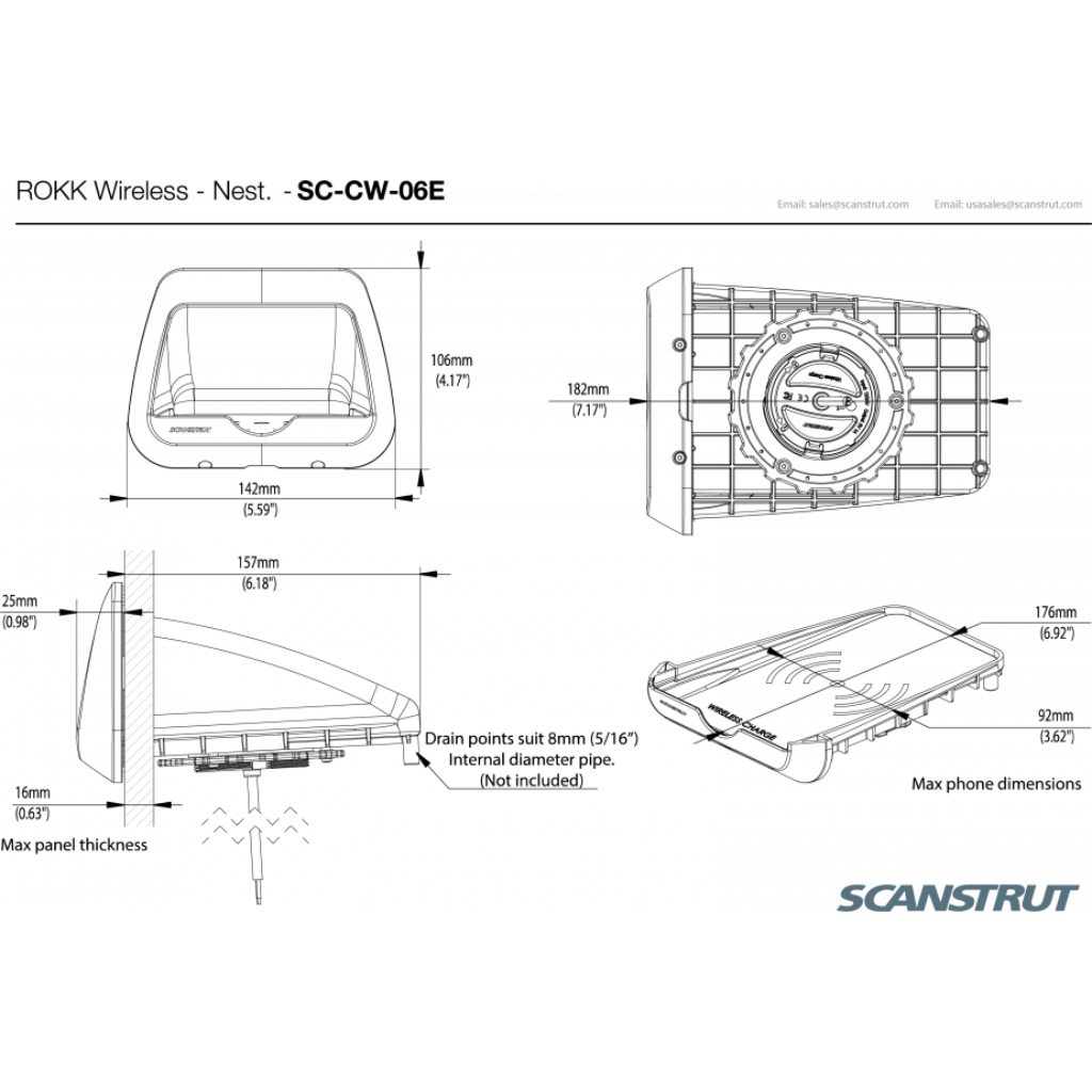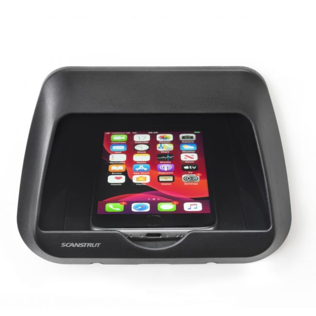 The SCANSTRUT SC-CW-06F ROKK Wireless Nest 12/24V Waterproof Phone Charging allows you to charge your device with no messy wires, whether it be in your RV, boat or outdoor setup. The Rokk Wireless Charger is completely waterproof, the unique technology is housed in an IPX6, fully encapsulated and sealed unit. The Nest provides tucked-away housing for your phone, keeping it out of the way while charging. Simply slide your phone into the pocket and instantly start wirelessly charging. The super grippy mat stops your phone sliding around inside. The front lip with an easy access thumb bevel acts as a safety barrier, making sure your phone stays in the Nest! The new upgraded 10W chargers are up to 60% faster and have been designed for the latest generation of power-hungry devices and apps. Featuring Qi-certified wireless charging technology and a “Smart” LED that indicates when your phone is charging. The foreign object detection and thermal cut-off guarantee’s safe, reliable charging in all environments. Compatible with wireless charging enabled phones of all sizes from all major brands including Samsung, Apple and many more. Charging is also possible through non-metallic, waterproof cases. With the same great look, ROKK Wireless is tried and tested in all corners of the globe in all weathers, and conditions. |
