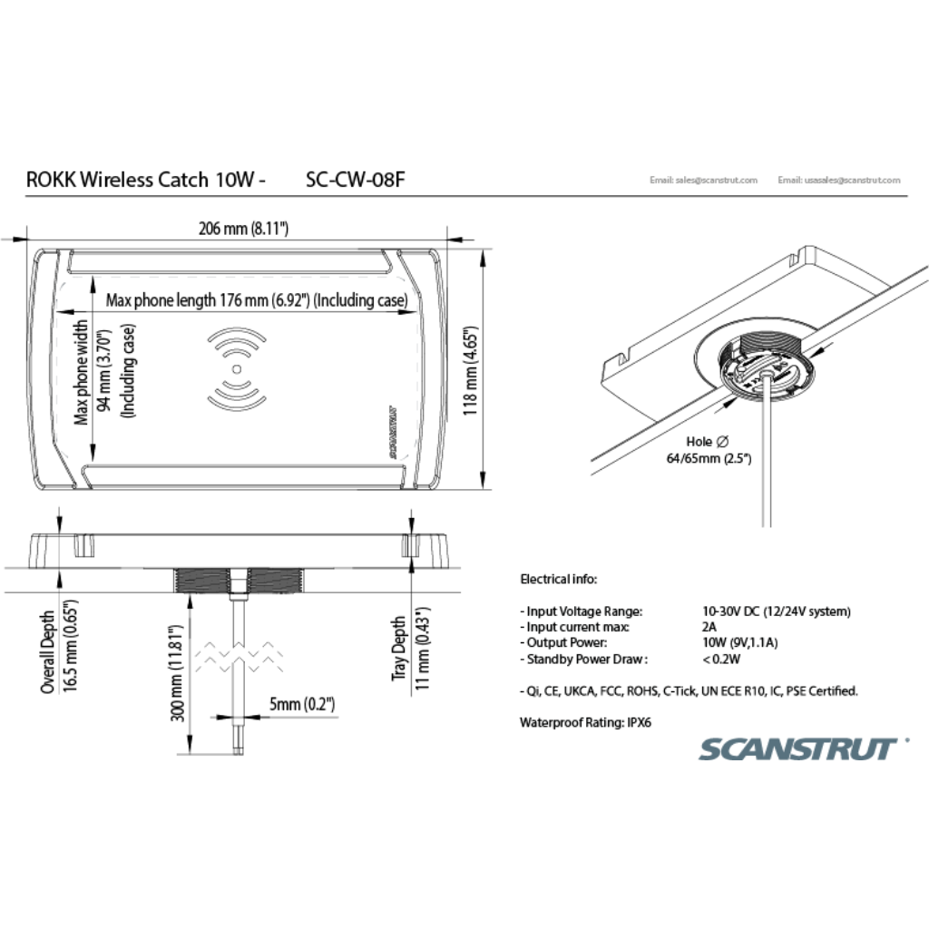 The SCANSTRUT SC-CW-08F ROKK Wireless Catch 12/24V Waterproof Phone Charging allows you to charge your device with no messy wires, whether it be in your RV, boat or outdoor setup. The Rokk Wireless Charger is completely waterproof, the unique technology is housed in an IPX6, fully encapsulated and sealed unit. Catch is the ideal for charging your phone and keeping it secure even on a bumpy ride. The edging bumpers stop your phone from sliding out, and lets the mat Catch your phone from any angle! Made with Closed Cell EVA foam, Catch offers great shock absorption and anti-vibration for your phone while being extremely hard-wearing, waterproof, and self-draining, stopping bacteria and mildew from building up. The new upgraded 10W chargers are up to 60% faster and have been designed for the latest generation of power-hungry devices and apps. Featuring Qi-certified wireless charging technology and a “Smart” LED that indicates when your phone is charging. The foreign object detection and thermal cut-off guarantee’s safe, reliable charging in all environments. Compatible with wireless charging enabled phones of all sizes from all major brands including Samsung, Apple and many more. Charging is also possible through non-metallic, waterproof cases. With the same great look, ROKK Wireless is tried and tested in all corners of the globe in all weathers, and conditions. |