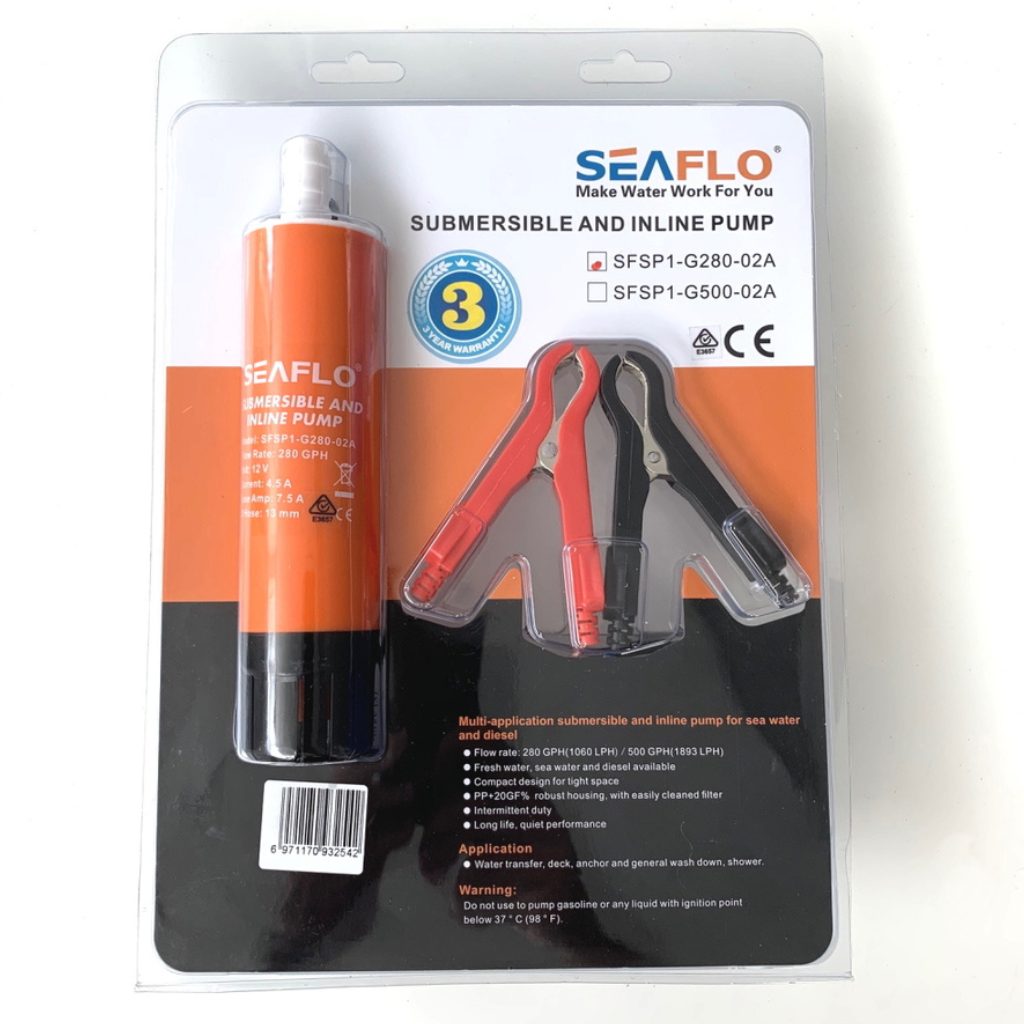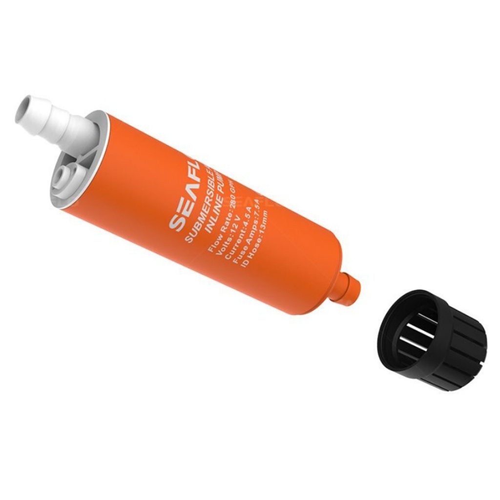 Seaflo 280GPH Submersible & Inline 12V Pump. A multi-application submersible and inline pump! With the Submersible Inline Water Pump you can pump clean water or diesel, and it can function as either a flooded suction water supply pump or an inline booster pump! Its compact design allows it to fit into small spaces. |