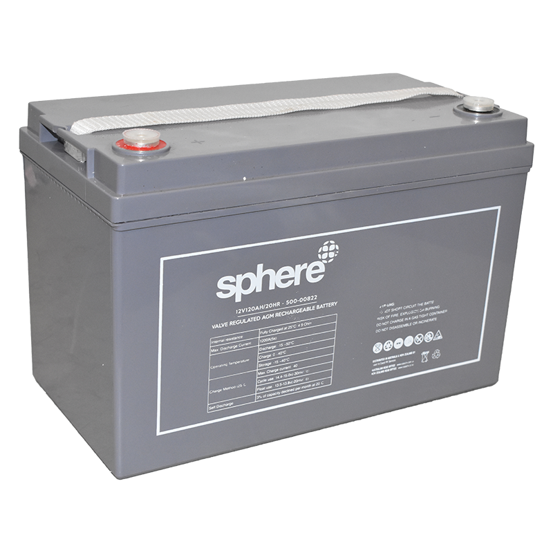 Sphere 500-00822 12V 120AH Valve Regulated AGM Rechargeable Battery. Sphere 12V Valve Regulated AGM Rechargeable Batteries are ideal for use in caravanning and camping, the AGM design offers improved discharge and recharge efficiencies. They require less maintenance, are spill proof and are safer for you and the environment compared to conventional alternatives. |