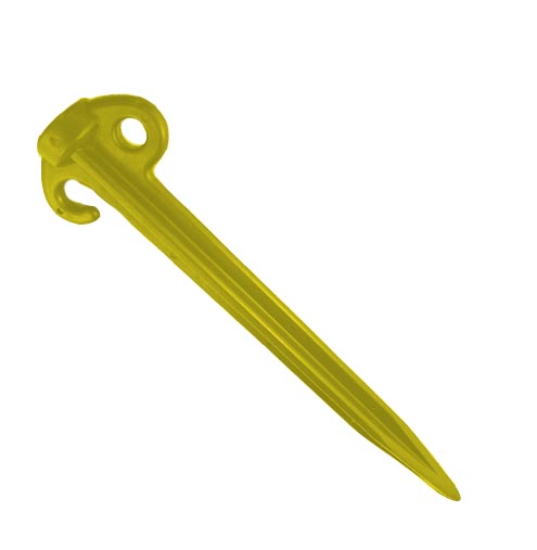 Plastic supa tent peg (yellow 490mm) A Plastic peg with a heavy duty design and available in polycarbonate and polypropylene. Suits sand and soil with high visible colours available. The large head is suited for high impact with supa strong hook and eye for rope and trace springs. PLY169 yellow polycarbonate 490mm |