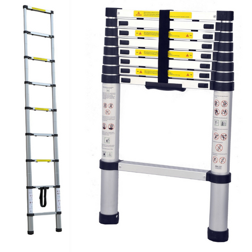 Transeng TRA-TL2.6M 2.6m Telescopic Ladder. Transeng’s 2.6m telescopic ladder is constructed of durable aluminium alloy with a safe working load limit of 150kg, thus making it sturdy and tough enough to withstand the even most demanding jobs. TRA’s telescopic ladder has 9 rungs in total, all opening & closing individually in increments of 30cm allowing you to set it at various heights to suit the task at hand. Collapsing down to 76cm & weighing 8kg this telescopic ladder is easy to transport and comes with a convenient heavy-duty carry bag with a shoulder strap. |