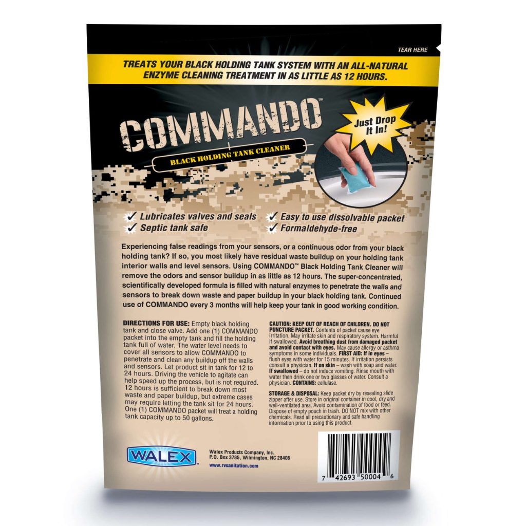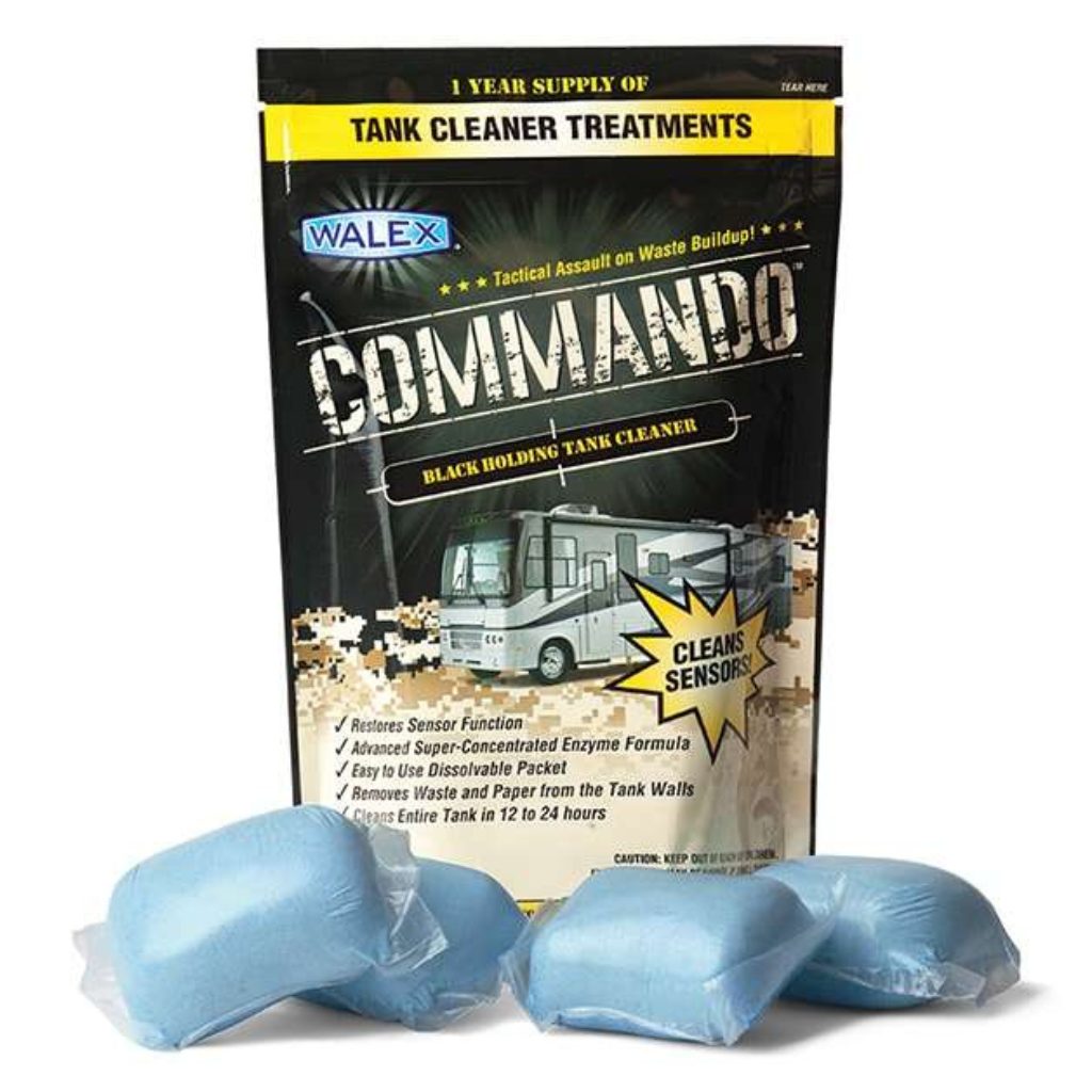 Walex Commando Holding Tank Cleaner. Experiencing false readings from your sensors, or a continuous odor from your black holding tank? If so, you most likely have residual waste buildup on your holding tank interior walls and level sensors. Using Commando® Black Holding Tank Cleaner will remove the odors and sensor buildup in as little as 12 hours. The super-concentrated, scientifically developed formula is filled with natural enzymes to penetrate the walls and sensors to break down waste and paper buildup in your black holding tank. Continued use of Commando every 3 months will help keep your tank in good working condition. |