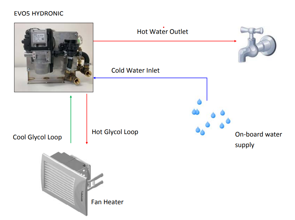 Webasto KTH-EVO5HYD-WM Integrated EVO5 Hydronic Hot Water Service. The EVO5 Hydronic, Integrated Hot Water System, is an industry benchmark for diesel fired hot water systems. The unit comes pre-assembled and tested for easy installation and can be operated whilst on the move, providing hot water and/or warm air. A Webasto Thermo Top Evo 5kW diesel furnace is mounted next to a 15L Buffer Tank which contains a Plate Heat Exchanger. This combination makes for a very compact unit. A Fan Heater is an optional extra to provide warm air. The Thermo Top Evo 5 heats glycol that is stored in the Buffer Tank (to approximately 80°C). This heated coolant goes through the Plate Heat Exchanger that has onboard water going through it as well. The water is heated via heat transfer. By utilising rubber heater hoses and brass plumbing fittings, you can incorporate a Fan Heater to provide you with the comfort of warm air. For complete Hot Water / Air Heater Service installation kit. Please purchase these additional items separately;